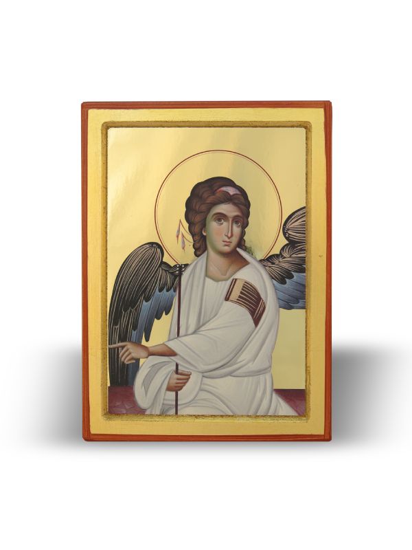 Predstavlja arhanđela gavrila koji sedi i rukom pokazuje u pravcu hristovog groba. Možete sami izabrati ram vaše nove slike, na način da se najbolje uklopi u vaš enterijer. Na slici je prikazan arhanđel gavrilo obučen u beo hiton koji sedi na kamenu i mironosicama rukom pokazuje. Umetnost ikonografije je nastala 787.. Predstavlja arhanđela gavrila koji sedi i rukom pokazuje u pravcu hristovog groba.